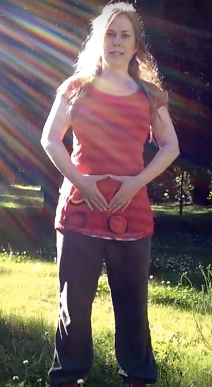 Beim Einatmen kannst du dir vorstellen, dass du frisches Qi oder Lebensenergie durch deine Hände einsammelst. Dabei bewegst du deine Hände wieder in die Ausgangsstellung zu dem Bereich unterhalb deines Nabels.